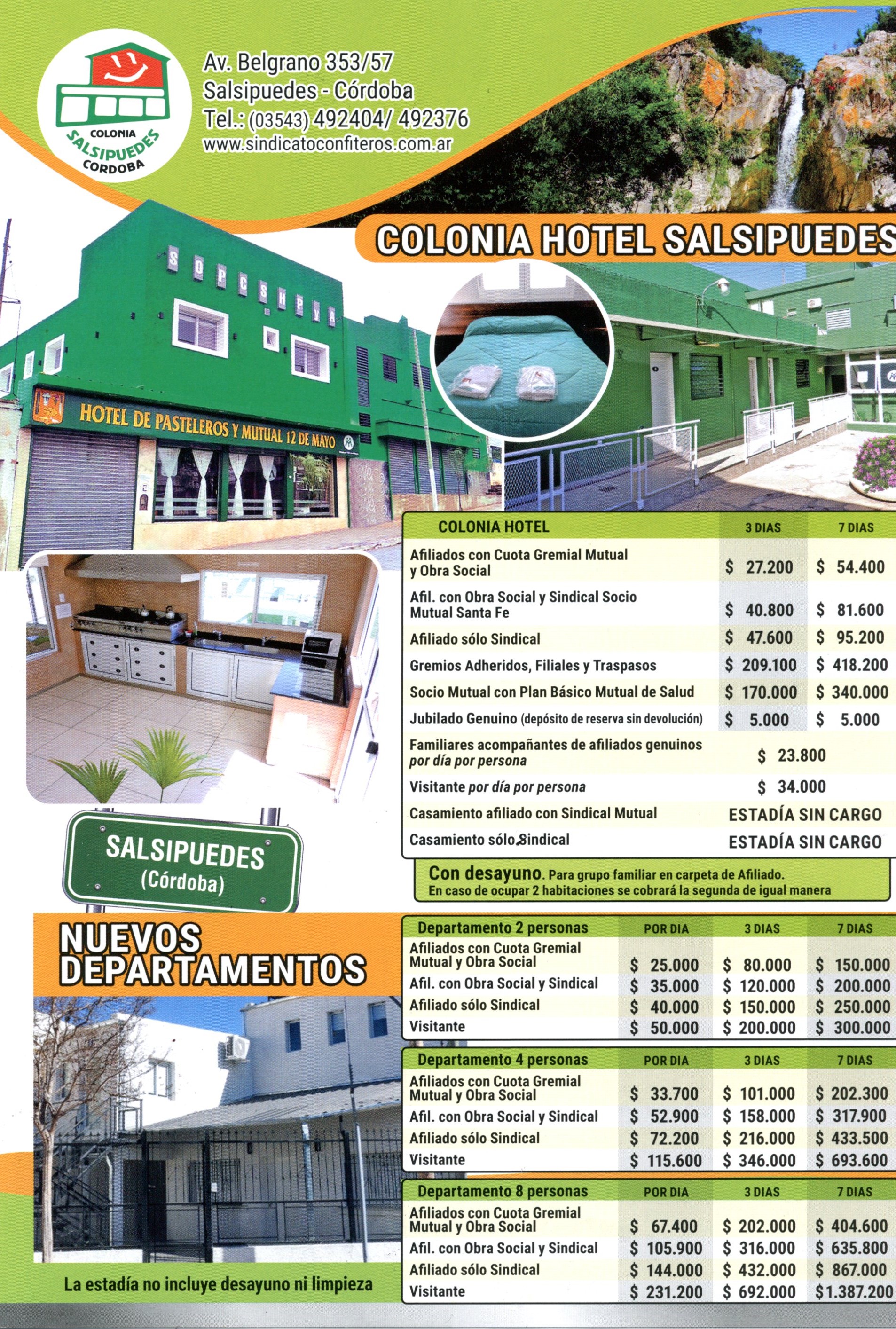 En Salsipuedes, el afiliado encontrara una opción para el descanso. La colonia de vacaciones Ernesto Paludetti, de Salsipuedes, Provincia de Córdoba, está a disposición del trabajador y es propiedad exclusiva del Sindicato de Pasteleros Rosario.