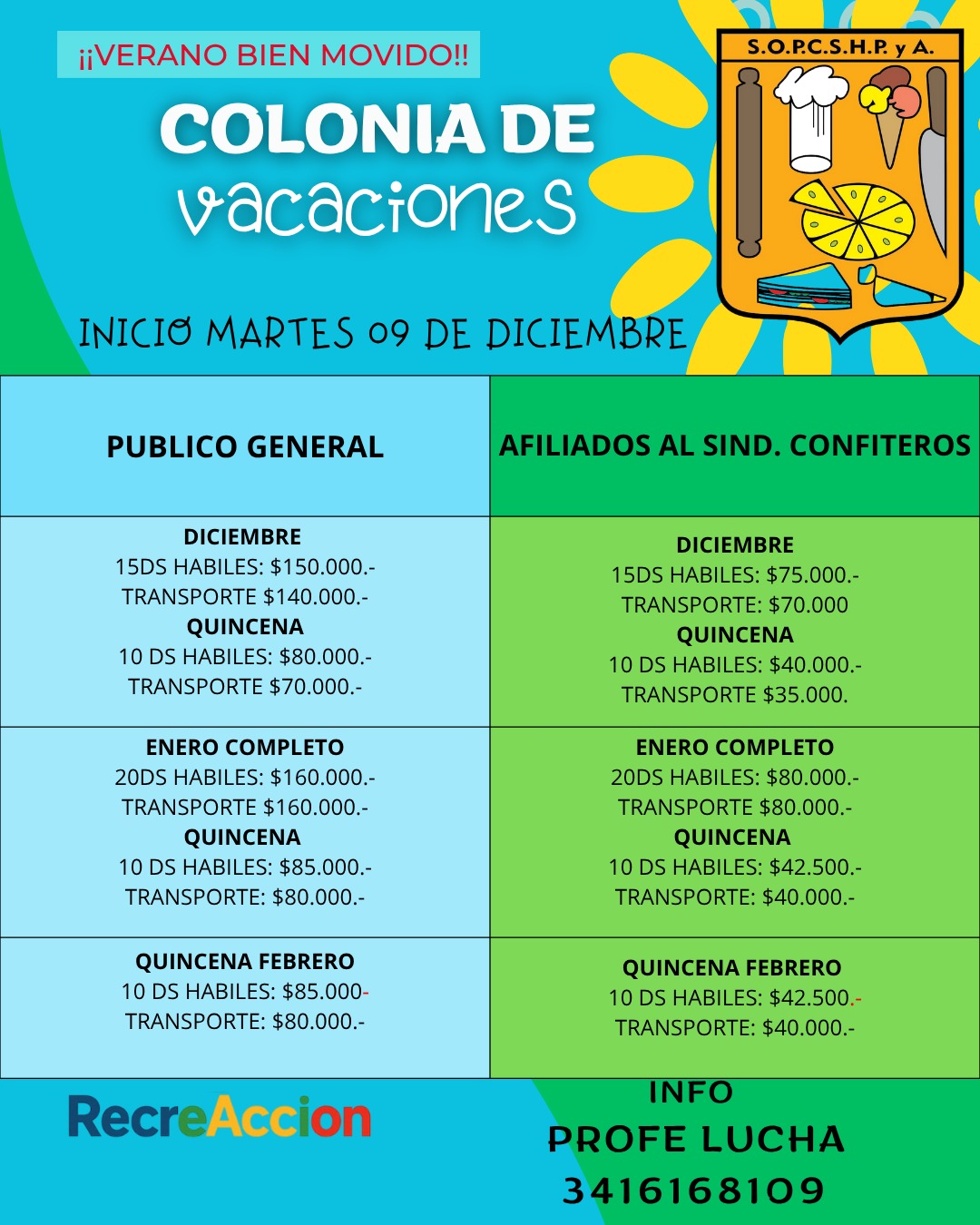 La colonia comienza el martes 9 de diciembre en nuestro camping y los hijos de Afiliados al Sindicato podrán acceder a un 50% de descuento.