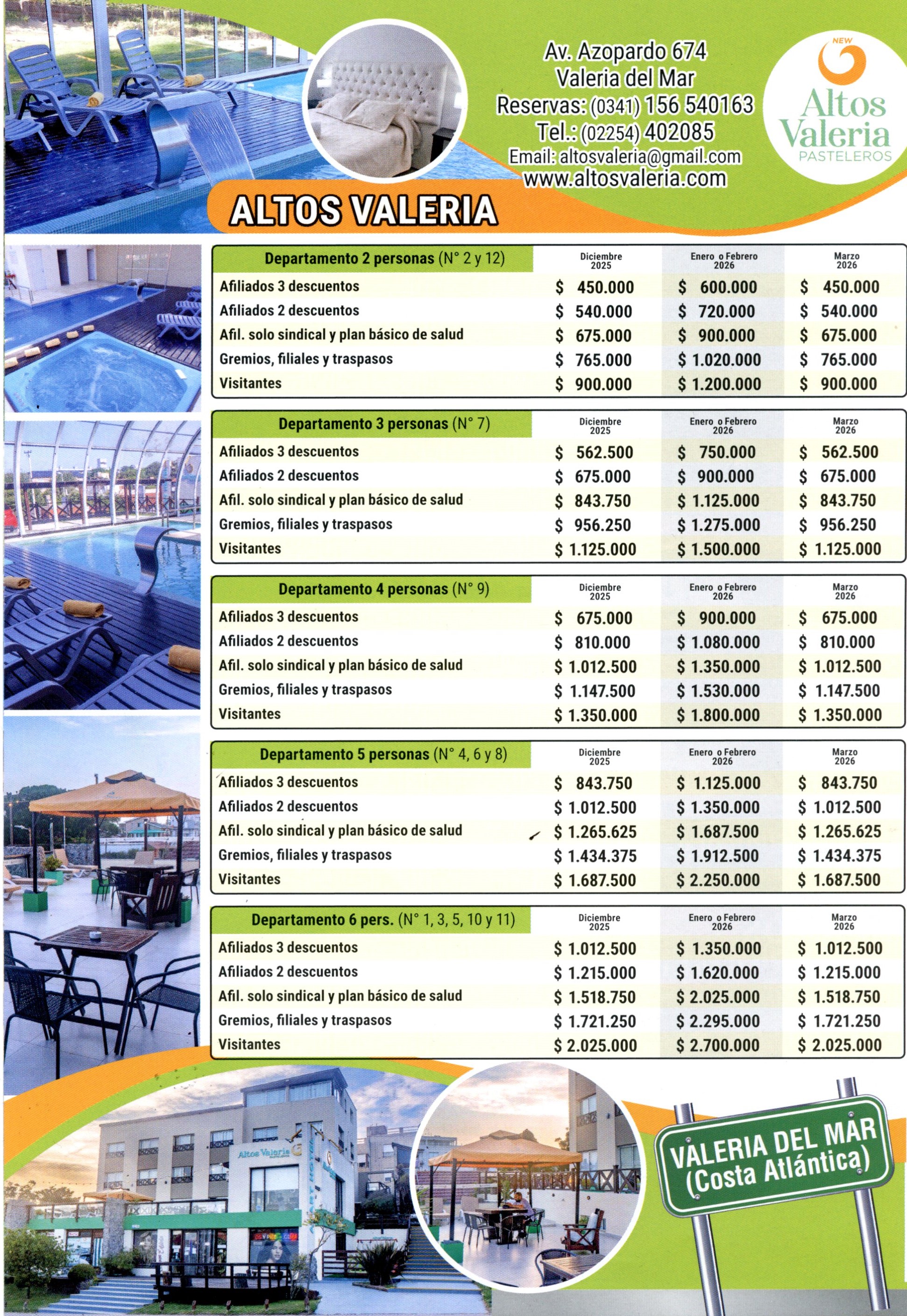 Contacto: New Apart Altos Valeria Pasteleros: 02254-402085 – Avenida Azopardo 674 – Valeria del Mar