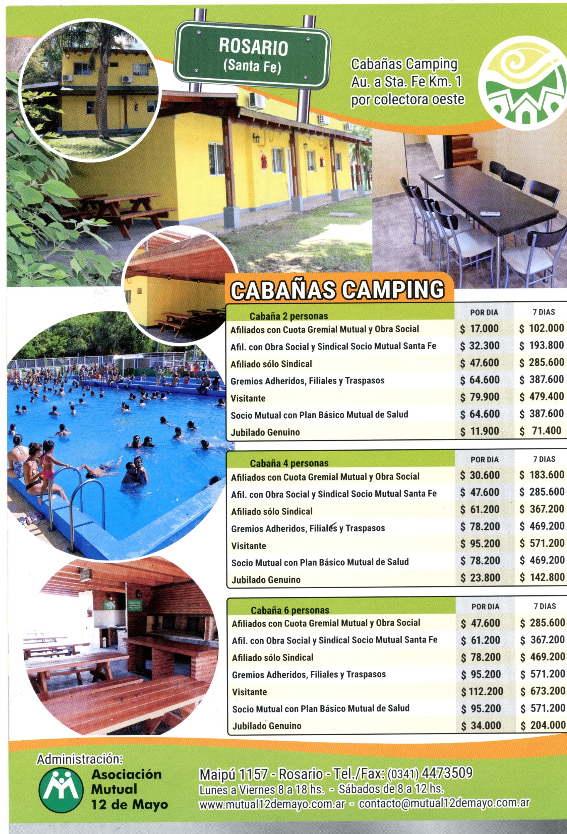 Para consultas y reservas de Las Cabañas: Mutual 12 de Mayo, Maipu 1157, Rosario.